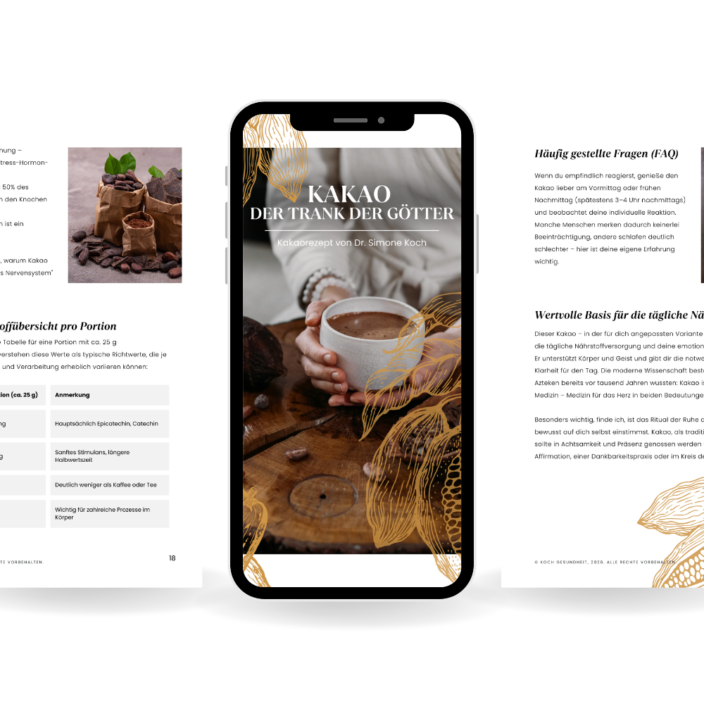Mein E-Book zeigt dir, warum Rohkakao weit mehr ist als ein Genussmittel: Er unterstützt dein Nervensystem, fördert Konzentration und Ausgeglichenheit und wird in der funktionellen Medizin längst als wertvolles Morgenritual geschätzt.